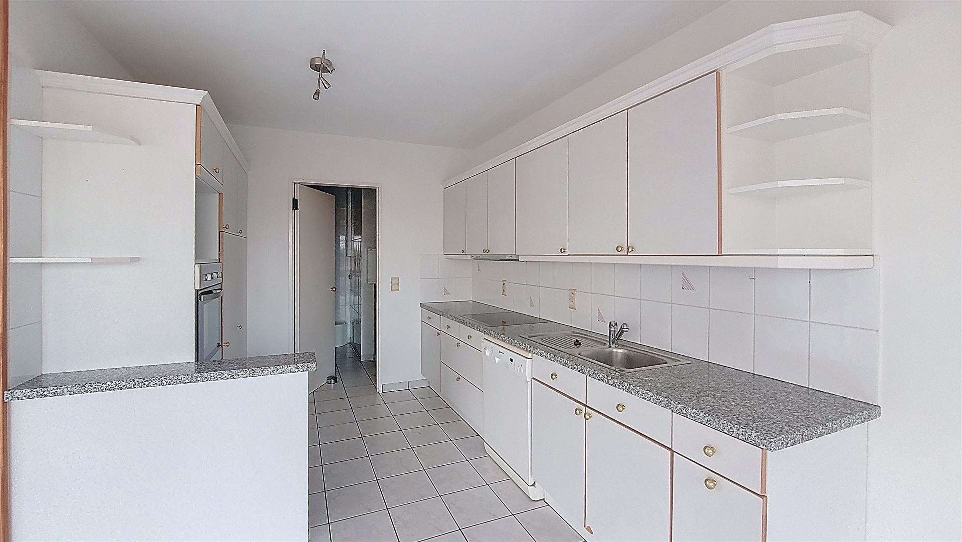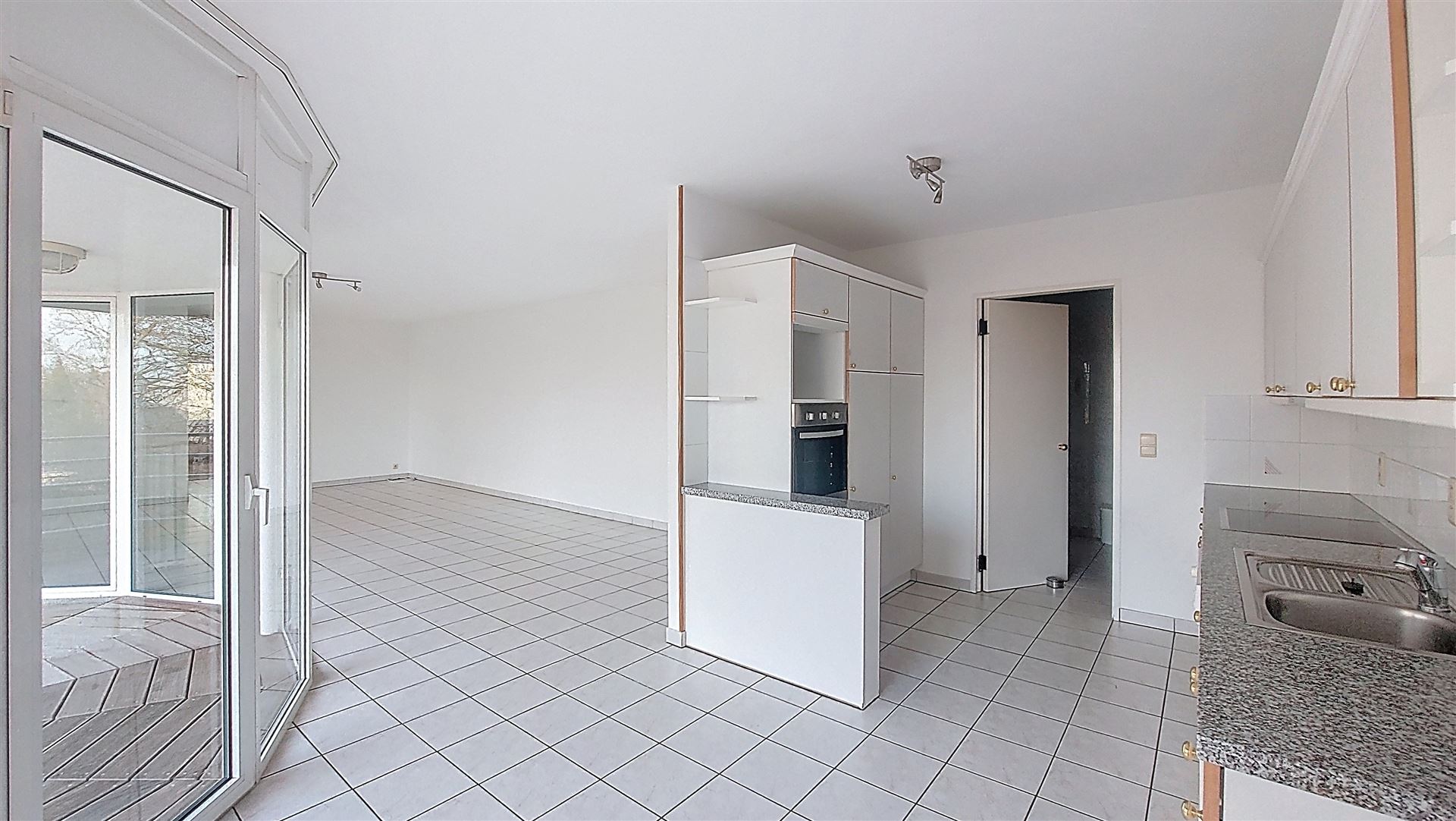 Une terrasse couverte, offrant une vue dégagée, agrémente l’appartement.