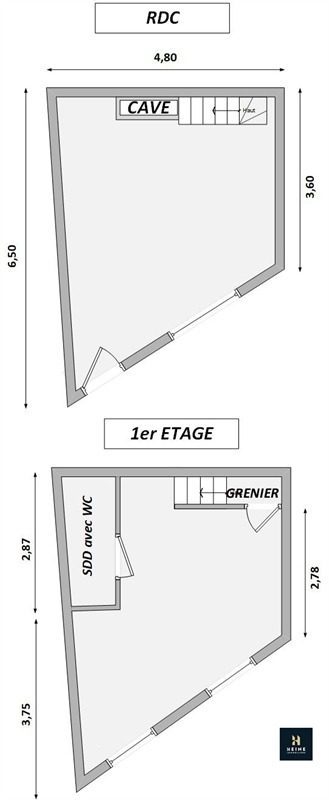1er étage: SDD + WC (2,20m²); Chambre (28,90m²)