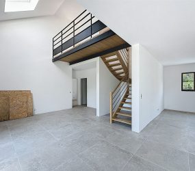 Il offre un hall d’entrée, un grand espace de vie ouvert sur la cuisine personnalisable, un salon, une buanderie, une première chambre et une salle de bains. A l’étage, vous trouverez 2 chambres supplémentaires, une salle de douche et un coin rangement.