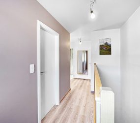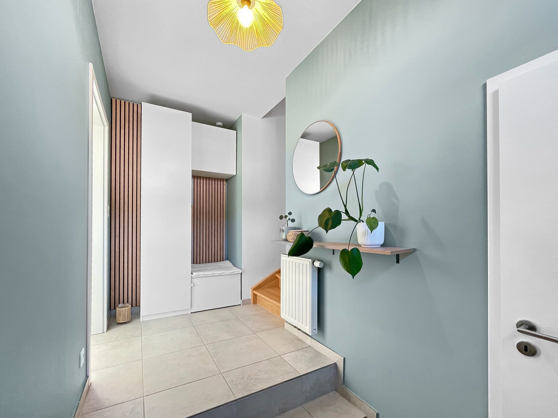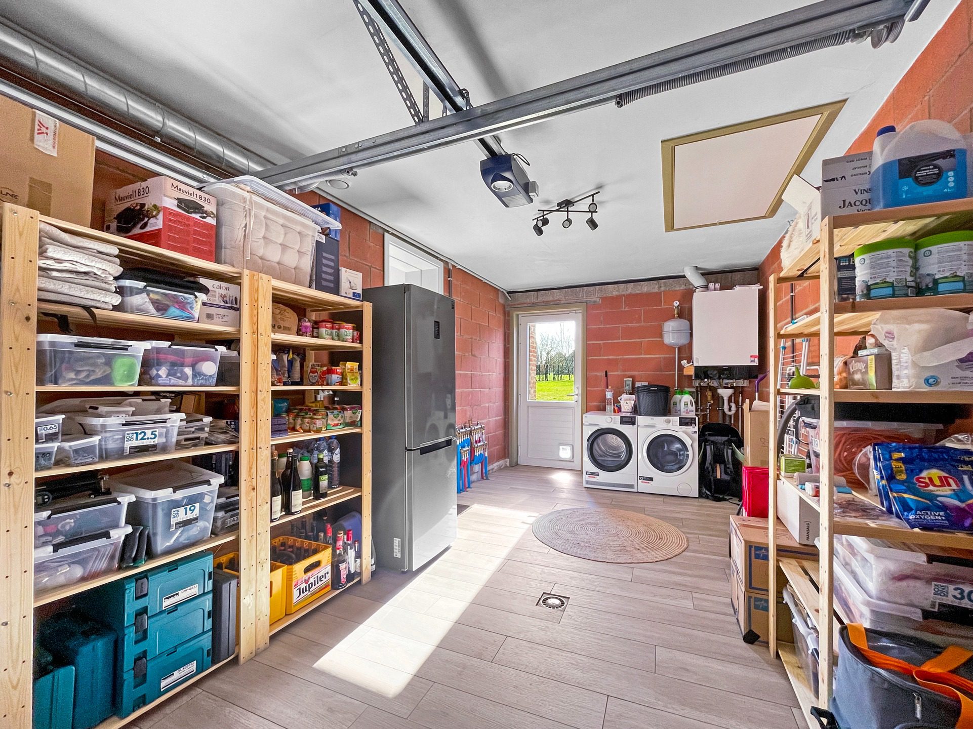 Un hall d’entrée avec coin vestiaire, une toilette indépendante, un vaste séjour lumineux avec salle à manger, une cuisine super équipée ainsi qu’un garage carrelé avec espace buanderie.