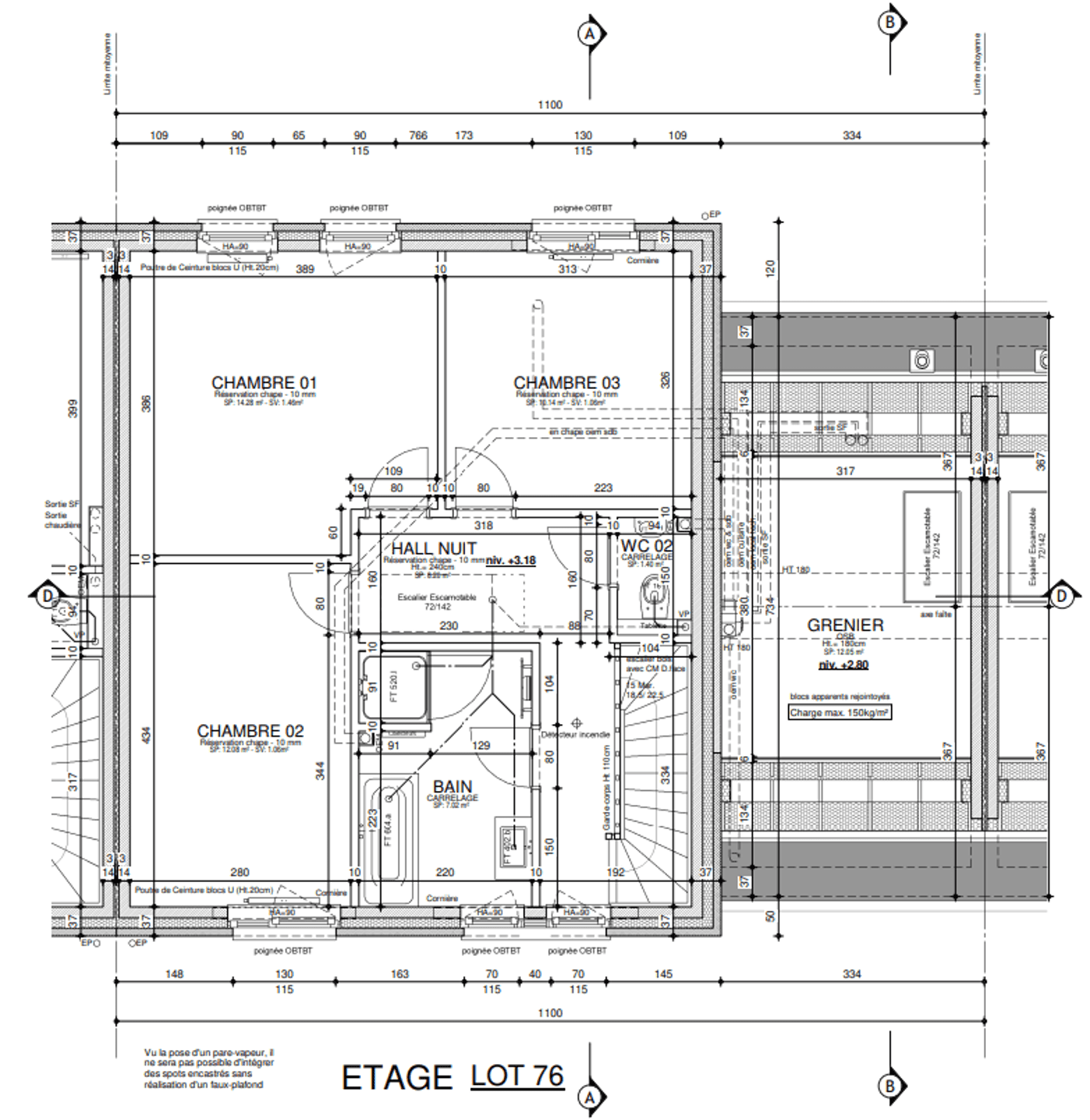Un second grenier d’environ ± 50 m², aménageable, est accessible par un escalier escamotable depuis le hall de nuit.