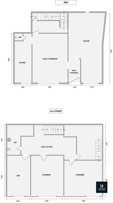 Rez: Hall d’entrée (2,80m²), séjour (25,35m²), salle à manger (14,40m²), cuisine (10m²), WC (1m²), hall arrière menant à l’étage (5,85m²)