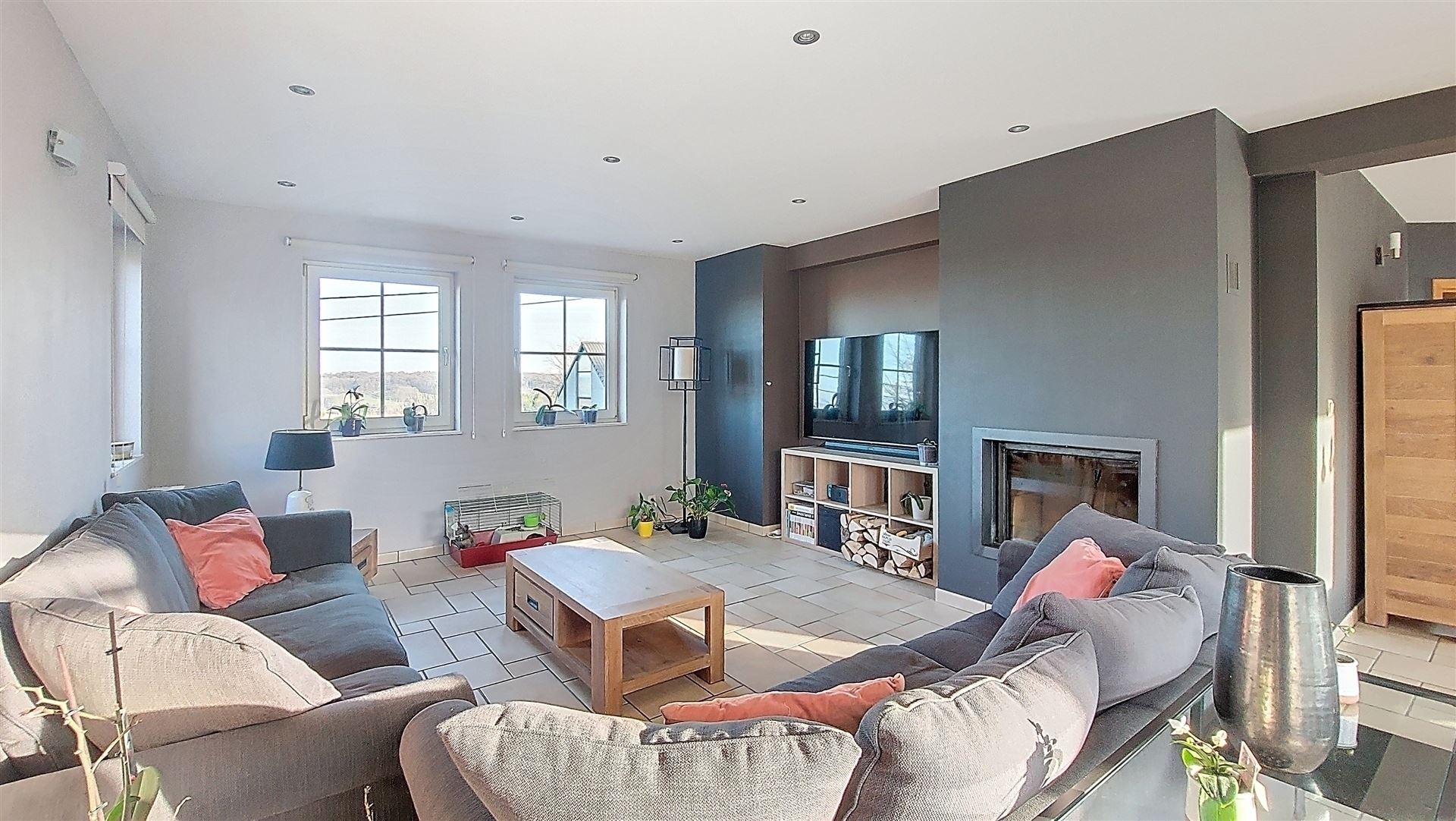 Celle-ci se compose, au rez-de-chaussée, d’un hall d’entrée avec vestiaire et toilette, d’un bureau, d’une spacieuse pièce de vie (+/-55m²) avec cuisine semi-équipée, espace salle à manger et grand salon avec cassette à bois, d’une buanderie.