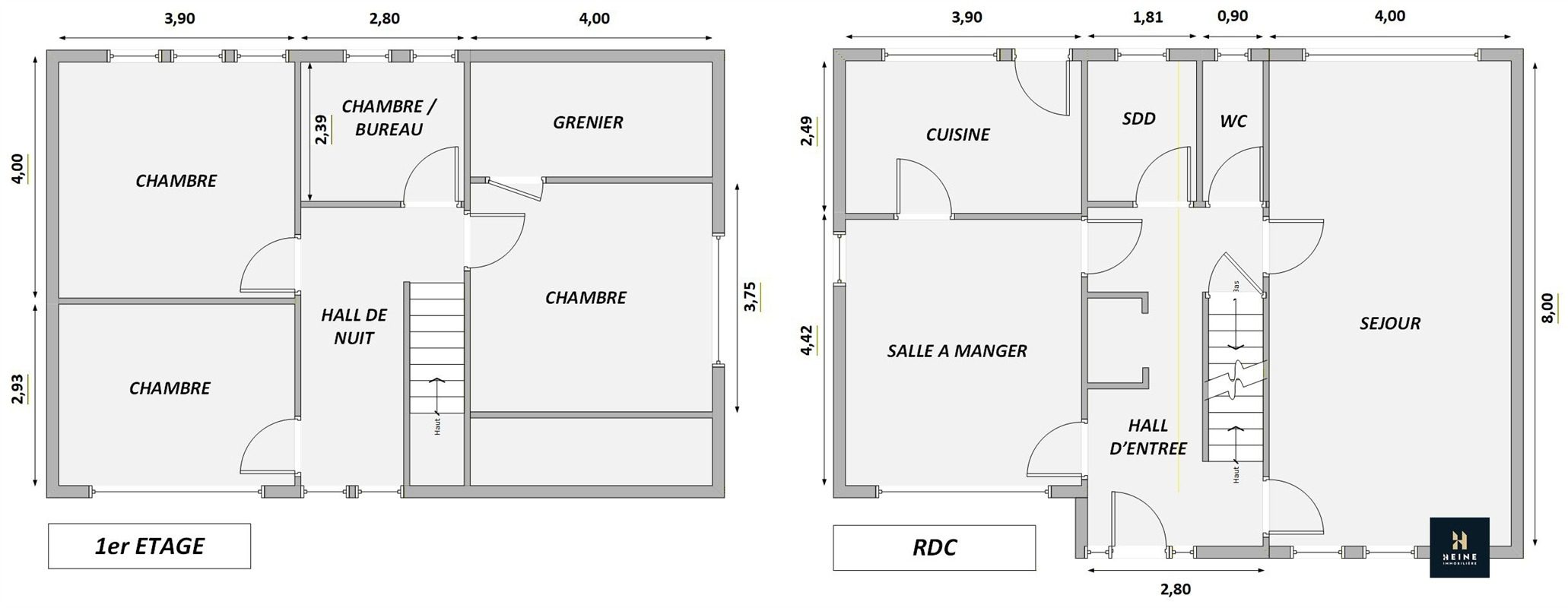 1er étage: Hall de nuit (12,65m²), 3 chambres (11,15m²; 15,30m²; 15,84m²), bureau (6,75m²), grenier de rangement (4m²)