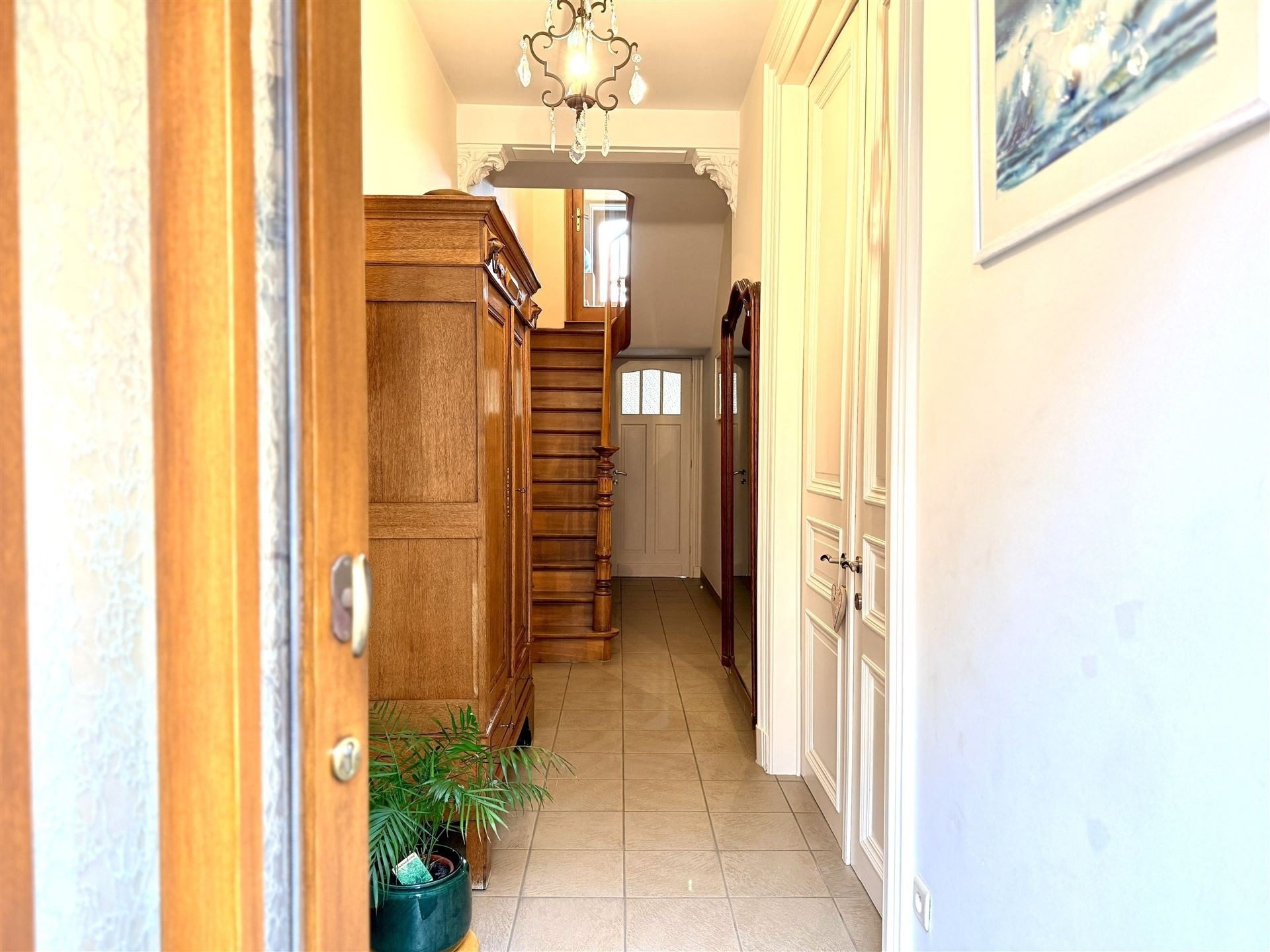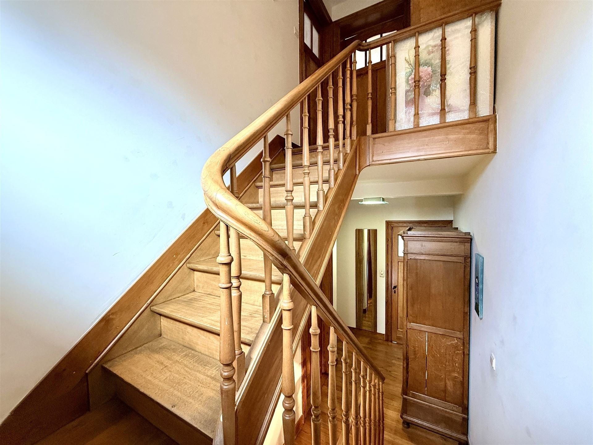 Elle offre, au rez-de-chaussée, un hall d’entrée avec wc menant à un bel espace en enfilade comprenant salon, salle à manger et cuisine équipée. Les étages accueillent 5 chambres spacieuses (de +/- 13 m² à 23 m²) et une salle de bains. Grenier et caves sous toute la superficie. À l’arrière, vous profiterez d’un agréable jardin aménagé dans un style champêtre, agrémenté dune terrasse orientée sud-ouest.