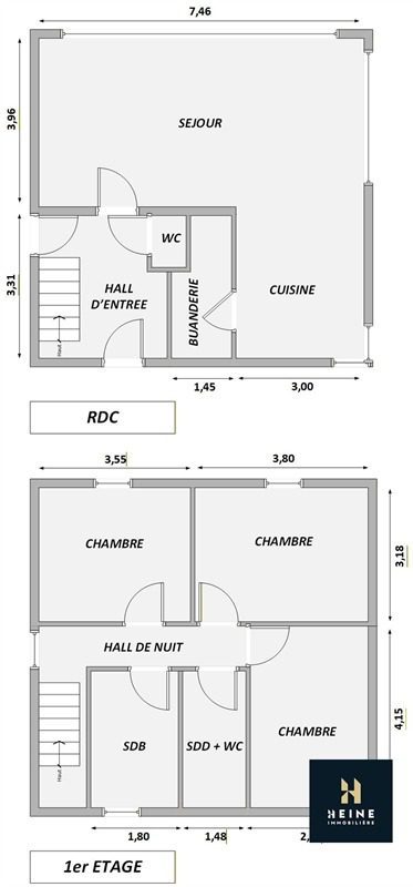 1er étage : Hall de nuit (4,2m² + 3,7m²); 3 Chambres (11,15; 11,30; 12m²)