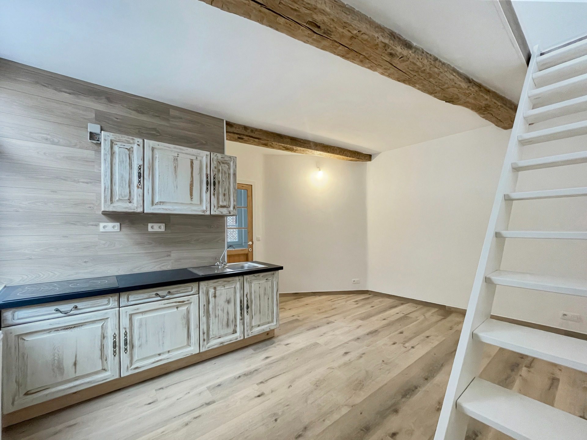 Le second étage accueille une cuisine équipée avec salle à manger, un espace convivial et baigné de lumière.