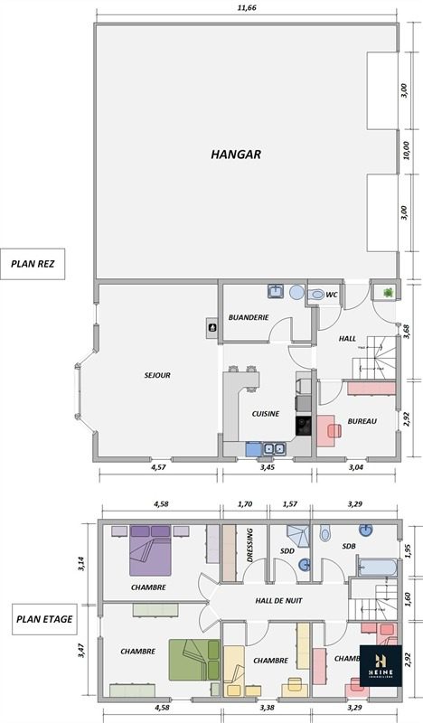 Rez: Hall d’entrée avec WC séparé (11,2m²); Bureau (8,95m²)