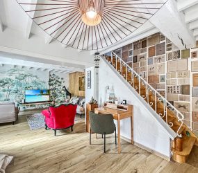 Demi-niveau supérieur : un bureau et un lumineux jardin d’hiver avec cassette à bois, offrant un accès direct à la terrasse et au jardin.