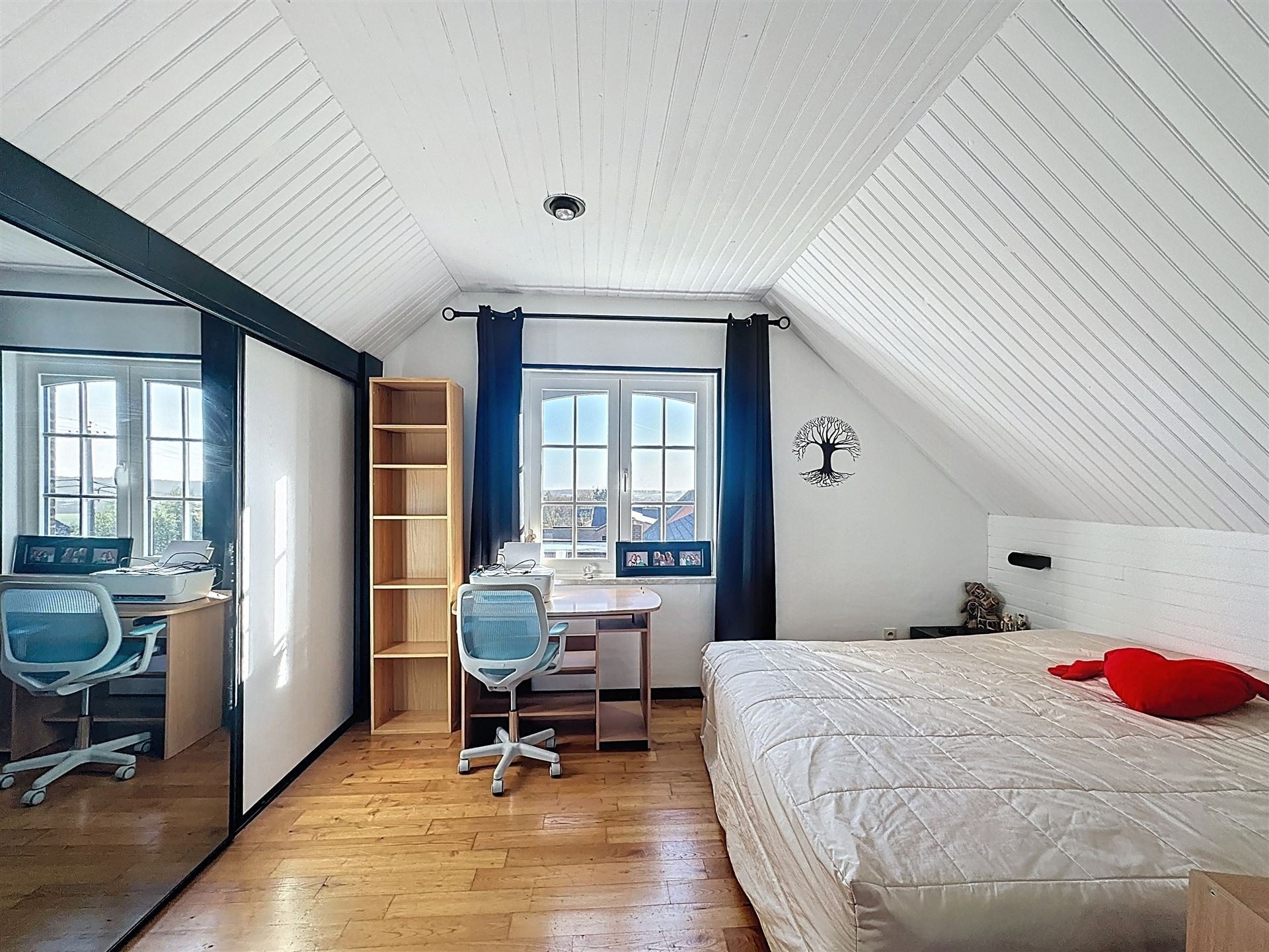 Elle offre, au rez-de-chaussée, un hall d’entrée, un spacieux espace de vie avec cuisine équipée ouverte sur le séjour, 2 chambres de 14m² et une salle de bains (baignoire et douche). L’étage propose 2 chambres supplémentaires dont une avec espace dressing et une salle de douche.