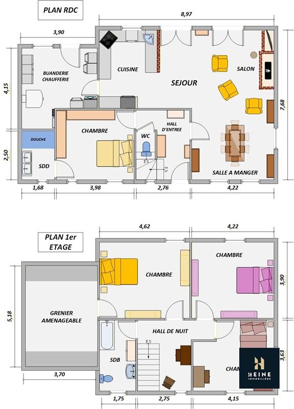 1er étage: Hall de nuit (8m²); 3 Chambres (18; 16,45; 14m²); SDB avec WC (6,3m²)