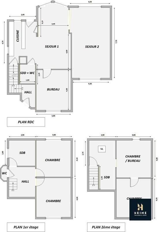 2ème étage : Hall (8,15m²); SDB (5m²); Chambre/bureau (15,30m²); Chambre (16m²)