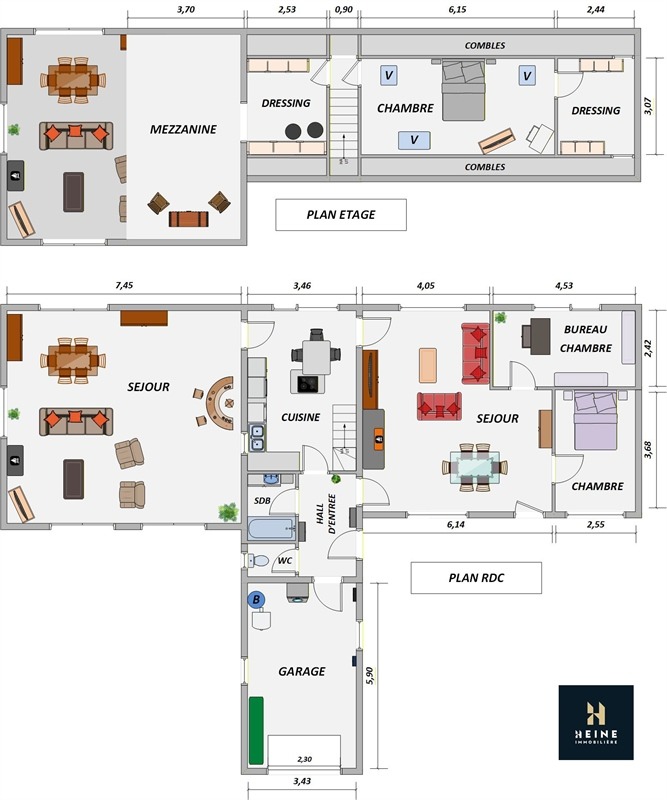 1er étage : Chambre (18,9m²); Dressing (7,75m²); Dressing/Bureau (7,5m²); Mezzanine (24m²)